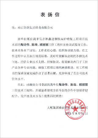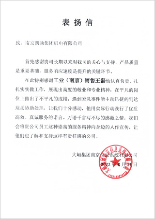 - 2022年8月,朗驰机电收到了来自大峘集团南京信息系统有限公司的感谢信,信中表达了对我司诚挚服务以及专业技术水平的赞扬。