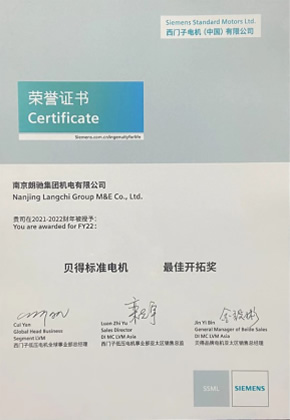 2022年10月18日,西门子电机(中国)有限公司召开贝得FY23财年第一次全国经销商会议,以上海为主会场,南京、北京、济南、泉州等多地设立分会场。朗驰机电受邀参会,并荣获2021-2022财年贝得标准电机业务“最佳开拓奖”。